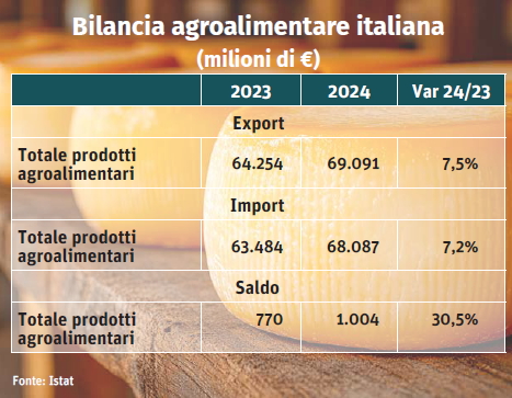 Si consideri che l’interscambio di prodotti primari (agricoltura, silvicoltura e pesca) ha determinato, nel 2024, un deficit di 13,2 miliardi di euro, con un valore delle esportazioni di poco più di 9 miliardi, a fronte di una spesa per l'import di 22,5 miliardi. Un disavanzo ampiamente controbilanciato dal surplus delle componente industriale del settore che ha generato esportazioni per 59,8 miliardi di euro e un saldo positivo di 14,2 miliardi.