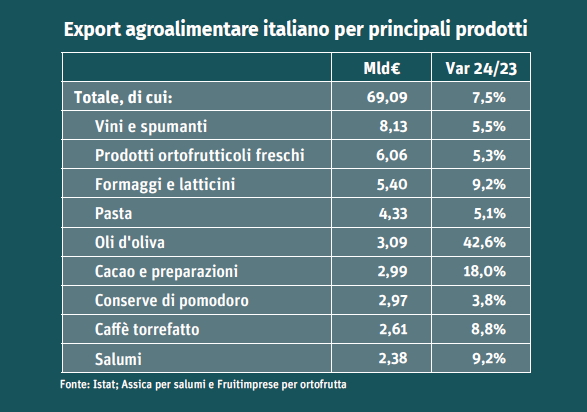 L’agroalimentare nel panorama dell'export tricolore si posiziona, in base alle ultime letture statistiche, sul secondo gradino del podio, per valore assoluto, dietro ai macchinari e apparecchiature, ma davanti a comparti di altrettanto spessore economico quali metalli e lavorazioni, tessile e abbigliamento e mezzi di trasporto. L’Italia è leader mondiale nell’export di pasta e conserve di pomodoro ed è seconda per le esportazioni di vini e oli extravergini di oliva. Considerevole anche il volume d’affari legato alle vendite all’estero di formaggi, salumi e prodotti ortofrutticoli, con posizioni di alta classifica per diversi prodotti tra cui mele, kiwi e uva da tavola.