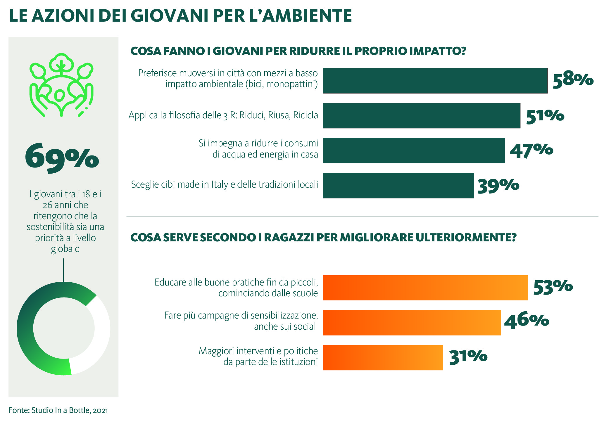 Accanto alla militanza però vanno accompagnati gesti concreti. Il sito specializzato “In a Bottle” ha chiesto a 1.100 ragazzi tra i 18 e i 26 anni cosa facessero nei fatti per ridurre il proprio impatto ambientale. Il 58% ha risposto che preferisce muoversi in città usando mezzi a basso impatto ambientale come biciclette e monopattini; il 51% ha dichiarato di seguire la filosofia delle tre “R” (Riduci, Riusa, Ricicla) che consente di diminuire gli sprechi energetici, il 47% di fare un utilizzo intelligente delle risorse in casa, con una riduzione dell’utilizzo di elettrodomestici e acqua corrente quando non sono necessari. Infine, con una scelta che sembra slegata ma in realtà è molto importante, il 39% dei giovani ha affermato di scegliere cibi made in Italy e piatti tipici delle tradizioni locali: questi ultimi infatti hanno un inferiore impatto ambientale, necessitando consumi inferiori per i trasporti e un inferiore utilizzo di prodotti inquinanti come pesticidi e diserbanti.